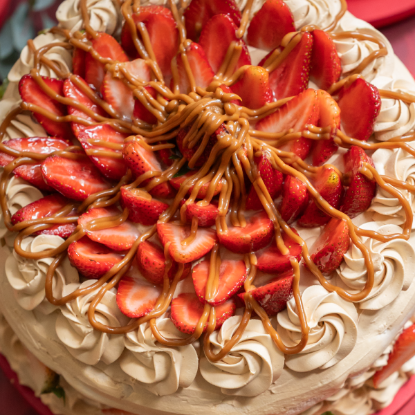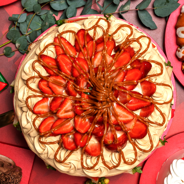 Pastel elaborado a base de espumilla con crema chantilly, fresas y caramelo.