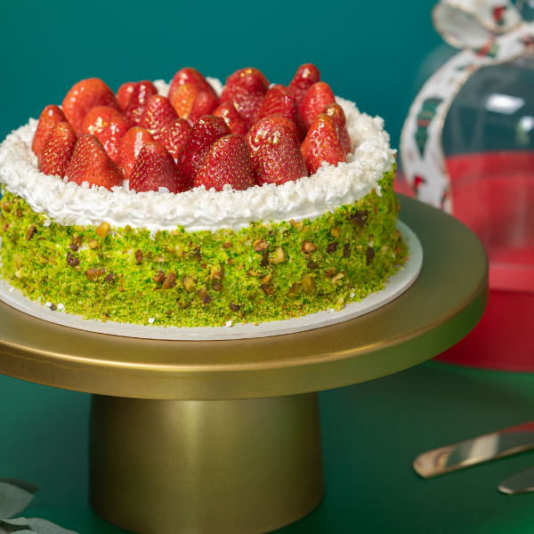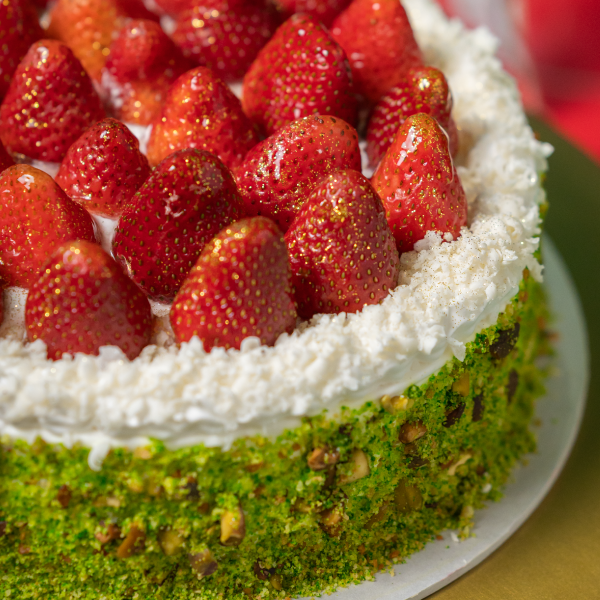 Pastel de queso horneado, decorado con fresas y acompañado de pistachos