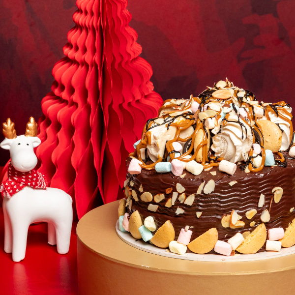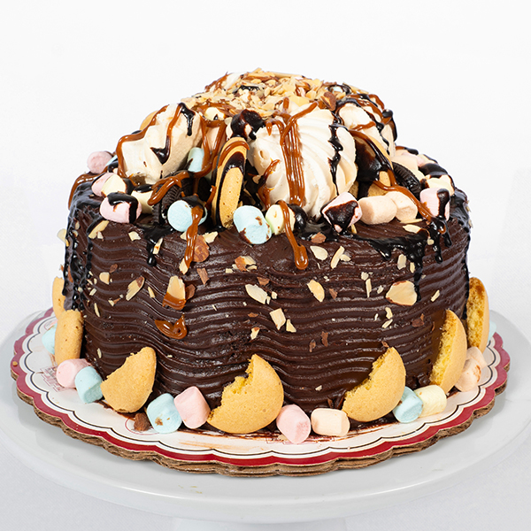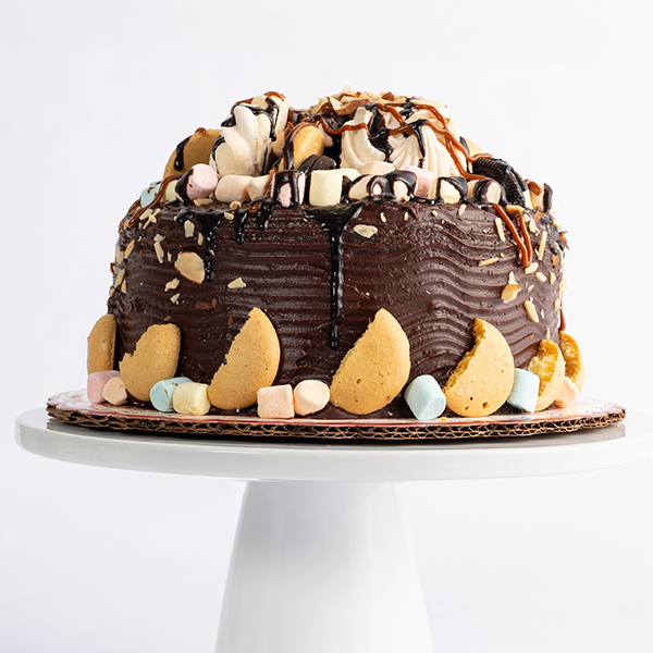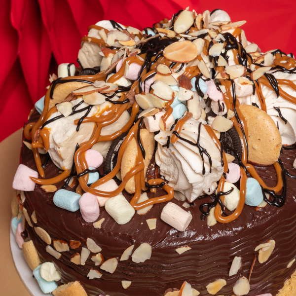 Torta de chocolate rellena con caramelo y marshmallows, decorado con galleta oreo, chocolate, caramelo, marshmallows y semillas de almendra.
