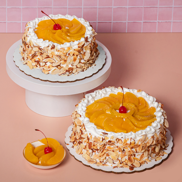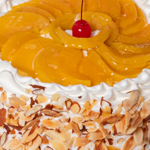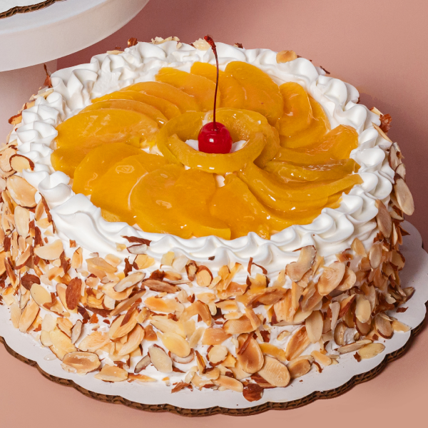 Torta de vainilla relleno con crema chantilly y melocotón, con remojo de tres leches.